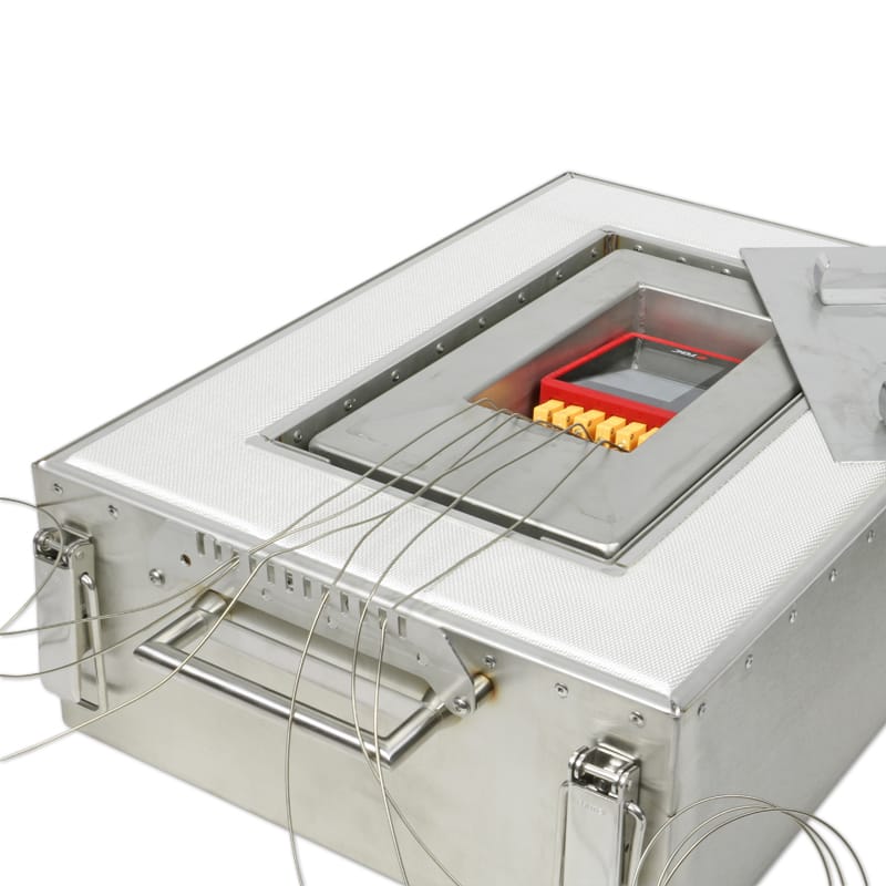 When conveyor ovens are utilized the CurveX data tracker has to travel with the parts on the conveyor through the oven. TQC provides a series of heat barrier systems to protect the oven data tracker from the high temperatures. A number of standard insulation boxes are available. Custom made barrier systems are available upon request for most applications. TQC manufactures barrier systems on request for any application, time and temperature of industrial ovens for enameling, ceramic curing, powder coating curing, wet paint curing, re-flow, tunnel kilns firing brick and roof tiles, tableware, sanitary ware, tile, refractory, heat treating, annealing, brazing, homogenizing, decorating, tempering, forming, frit sealing, normalizing, billet reheating, slab reheating, pressure. Standard TQC heat barriers systems consist of durable high-grade stainless steel outer boxes with special insulation material. Most system also carry a Hi-Tech heat sink that absorbs the heat that travels through the box over longer periods of time. It is always advised to utilize a box with a higher protection rate than what is minimal required for the total temperature profiling process. In unforeseen situations like a broken conveyor the logger will “survive” and ready for another go. FEATURES